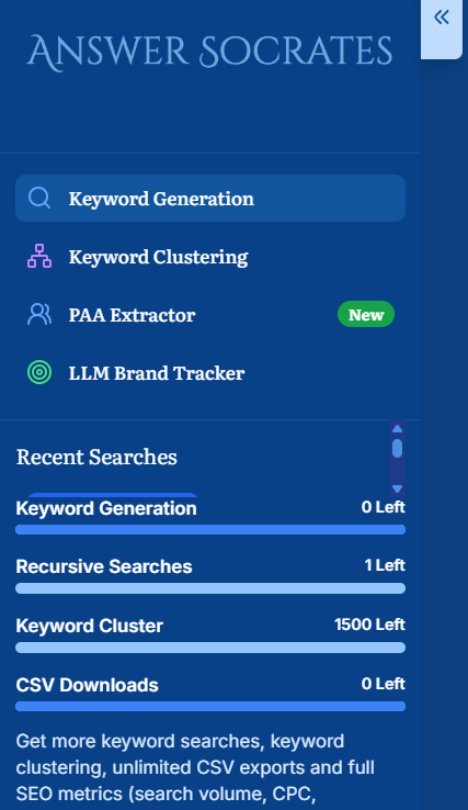 Yes, you can use Answer Socrates without paying upfront. You get limited daily searches, clustering credits, and basic keyword research features. Paid plans mainly unlock higher limits and advanced SEO metrics like search volume and CPC.