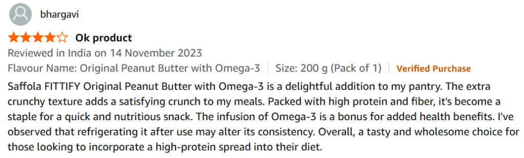 Saffola Fittify peanut butter comes under the trusted Indian household brand Saffola. It’s a good choice for people who are trying to manage their weight and eat healthier. It is made from good-quality roasted peanuts and is high in protein and fibre.