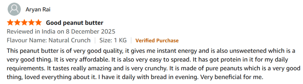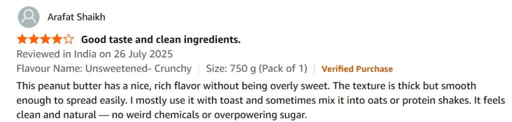 It’s made from good-quality peanuts. A reliable source of protein and fibre. No added colour, no preservatives, and no artificial sweeteners. Both creamy and crunchy variants are available. The taste is mild and familiar, which makes it great for kids and picky eaters.